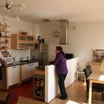 Die Sanierung wird in dem teilweise bewohnten Haus in Abstimmung mit den Mietern durchgeführt. Die Wohnungen werden deshalb in Etappen saniert und teilweise auch zusammengelegt.