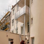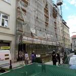 Die 2 Gründerzeithäuser sind während der Sanierung teilweise bewohnt und es werden neben einer thermischen Haussanierung mit Aufzugszubau (fast) alle Wohnungen saniert bzw. zusammengelegt und das